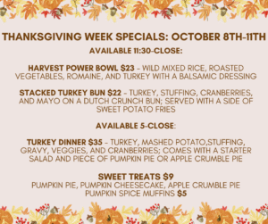 Thanksgiving is almost here, and with it comes a whole week of amazing specials! Come in any day starting this Wednesday, October 8th until October 11th and give these seasonal specials a try! We will also have a few seasonal desserts!